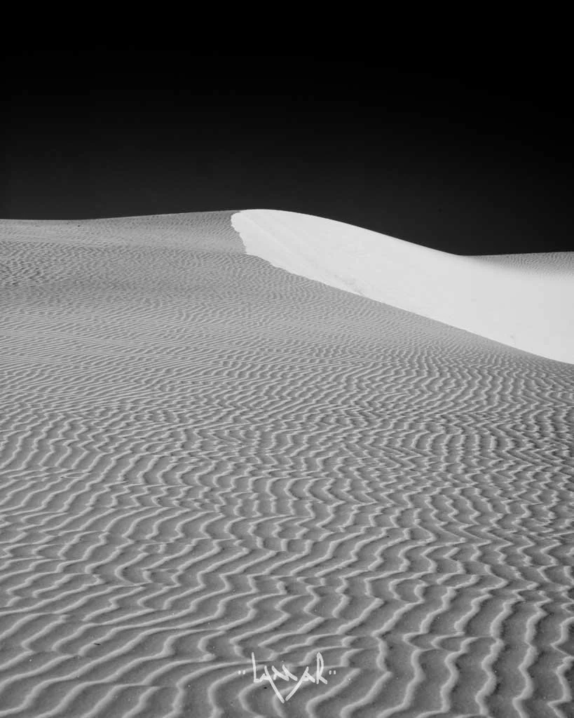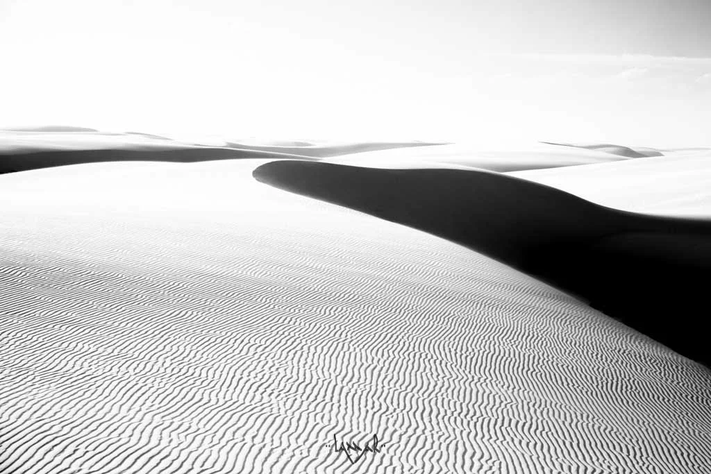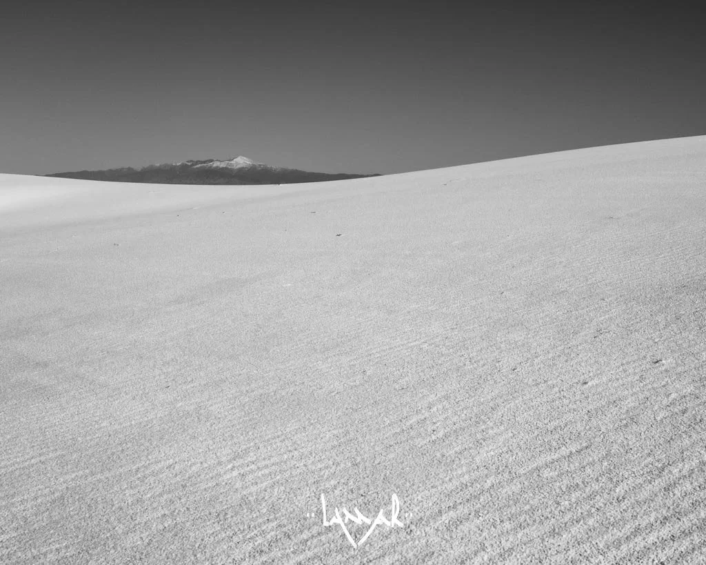 A hot, high desert landscape blanketed by white rolling dunes for as long as the eye can see, welcomely interrupted only by the vivid mountains on the horizon.